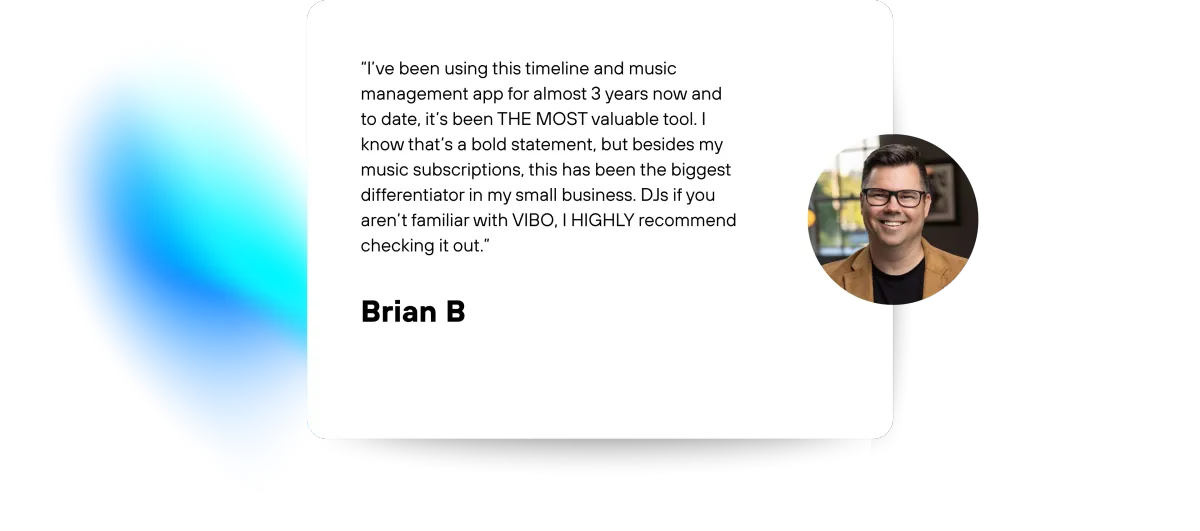 From the first meeting to prepping for the event, Vibo helps you through every step. Onboard your client, lock the timeline, export playlists to your DJ software, and download all the details you need.